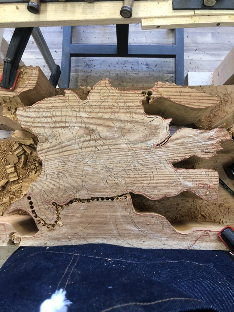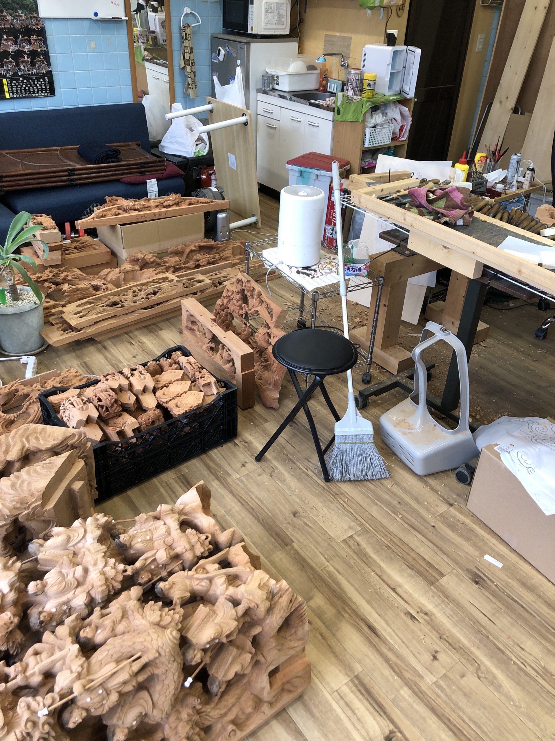 彫刻のかけつぎや、彩色させてもらってます。狭い仕事場なので、少しずつ運んできて、作業してます。