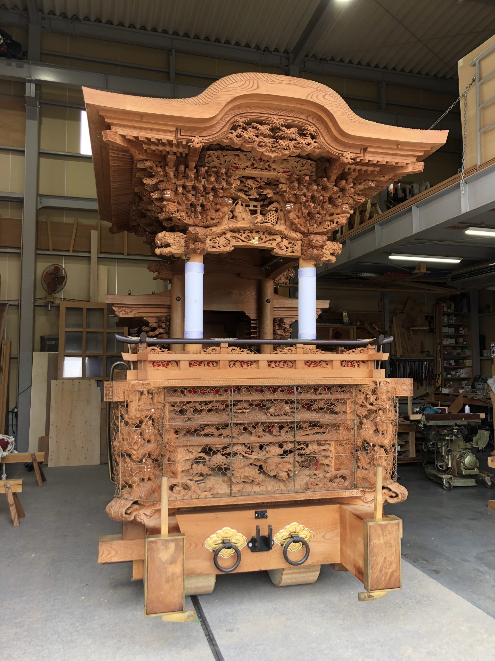 この春から彫刻修理させていただく、安松町の地車が、大真工務店さんに搬入されました。町会の皆さんに喜んでもらえる様、頑張りたいと思います。